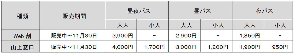 【料金】上記、夜パスまたは昼夜パスのとおり