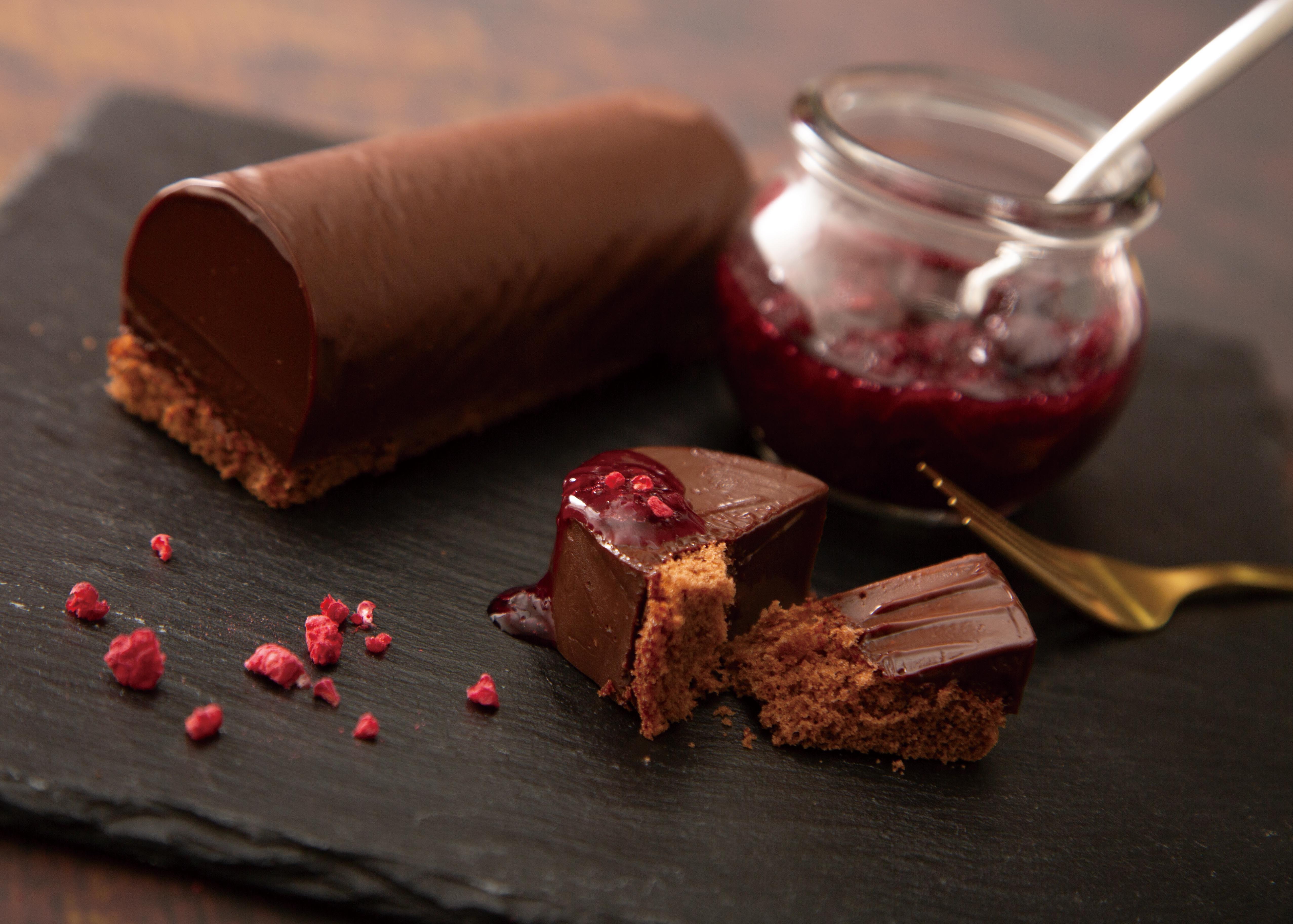サクサクと食感豊かな自家製ビスキュイジョコンドの上に、オレンジの皮を合わせたクリームをサンド。さらに、キャラメルショコラムースをのせてグラサージュを施し、艶やかでリッチな印象に仕上げました。オレンジの香りや、ねっとりと濃厚なキャラメルショコラムースの余韻が楽しめる満足感の高い逸品。