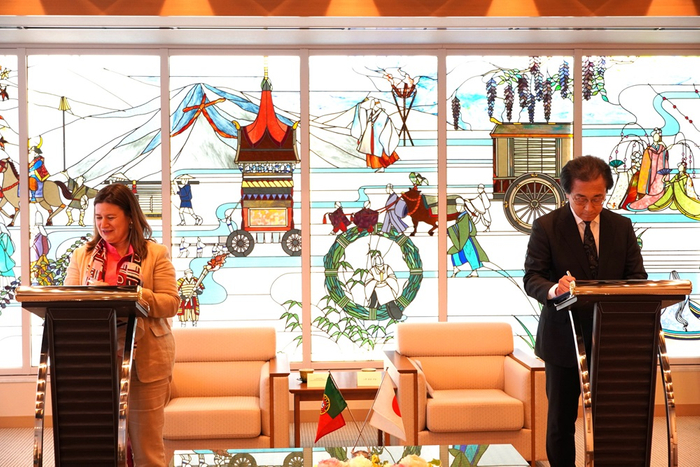 京都外国語大学は、4月18日(木)にポルトガル大使ヴィトル・セレーノ閣下立ち会いの下、カモンイス院のアナ・フェルナンデス総裁と学術講座設置に係る調印式を行いました。これは、ポルトガル政府の文化促進団体であるカモンイス院が本学と「ルイス・フロイス学術講座」を設置することを承認したことを受けて実施。この講座にその名を冠すルイス・フロイスは、戦国時代に日本で布教活動を行ったイエズス会の宣教師で、織田信長や豊臣秀吉と会見した経験を持ち、戦国時代を外国人の視点から観察し、『日本史』を著しました。この著作は戦国時代を研究する貴重な資料として高く評価されており、本学の故・松田毅一名誉教授と故・川崎桃太名誉教授が、『日本史』(中央公論社、全12巻)を初めて完訳するなど、本学とフロイスの間には深い縁があります。カモンイス院の学術講座は世界の主要23か国に設置されていますが、今回の調印により日本で初めて本学に学術講座が設置されることになります。この調印式の様子は、現地ポルトガルの新聞「Diário de Notícias」でも大きく取り上げられました。