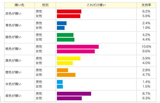 ただし、下のアンケートには続きがありました。嫌いな色についての質問もあり、赤が嫌いという人も一定数いることがわかるので要注意。