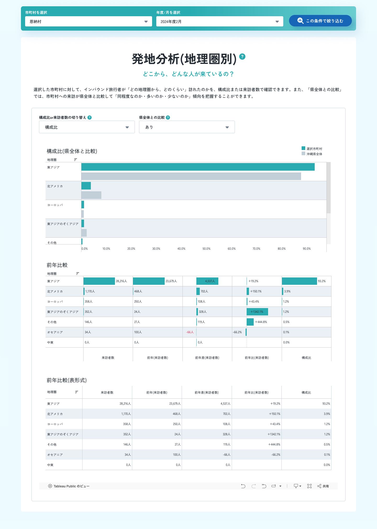 たとえば、ある市町村で特定の地理圏の比率が県全体より高いと分かれば、その背景にプロモーションの影響や訪問動機に合う観光資源がある可能性が考えられます。また、国別に見て特定国の比率が急増している場合、ターゲットに応じた受入対応(言語・食文化・情報発信手段など)を優先的に検討する手がかりとなります。