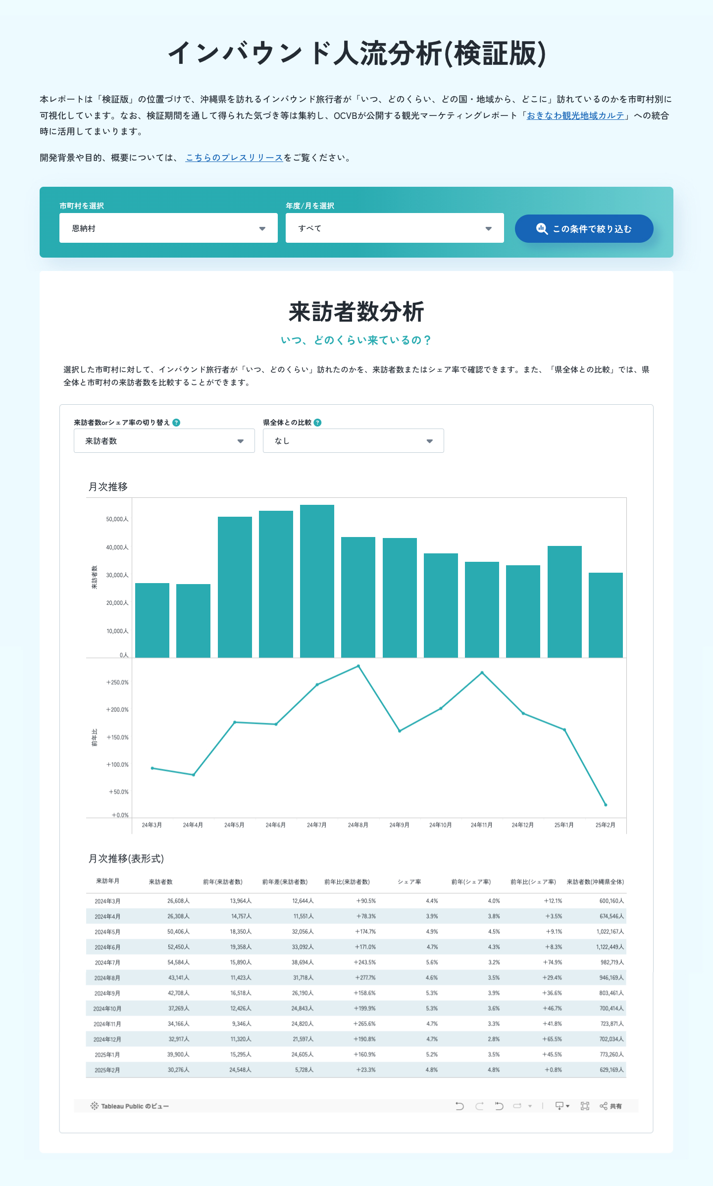 株式会社DATALE(本社:沖縄県那覇市、代表取締役:板谷越 英美、以下「DATALE」)は、株式会社ブログウォッチャー(本社:東京都中央区、代表取締役社長:新村 生)と共同企業体を組成し、一般財団法人沖縄観光コンベンションビューロー(会長:下地 芳郎、以下「OCVB」)が、「おきなわ観光地域カルテ」上に2025年5月29日(木)に公開した「インバウンド人流分析(検証版)」のダッシュボード開発を行いました。
