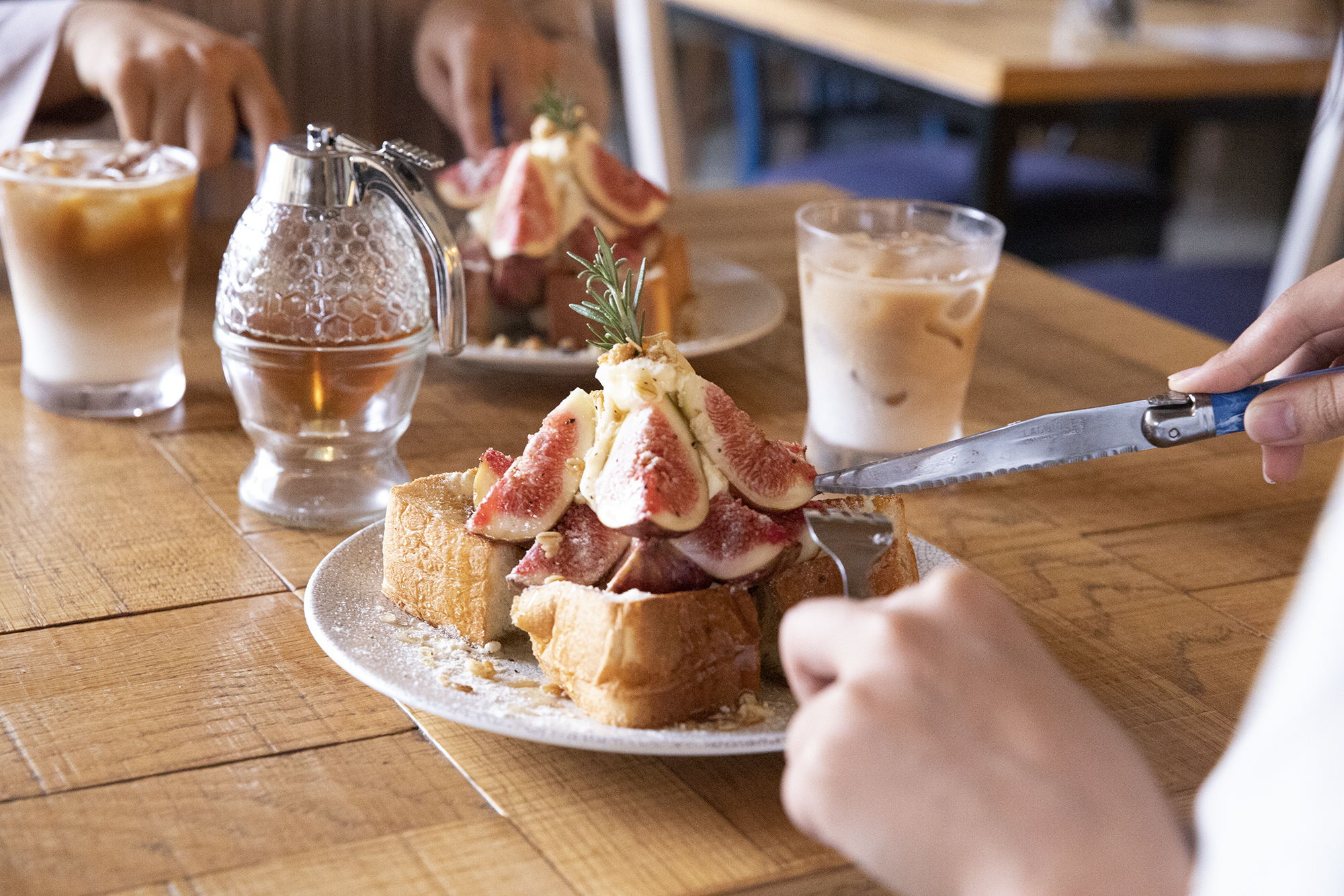 マスカルポーネチーズは、北海道産を使用。なめらかな甘みとミルクの持つコクが特徴です。その上には完熟いちじくを3個分乗せる贅沢さ。仕上げに、たっぷりとかかけるはちみつは、言うまでもなくバツグンの相性です。