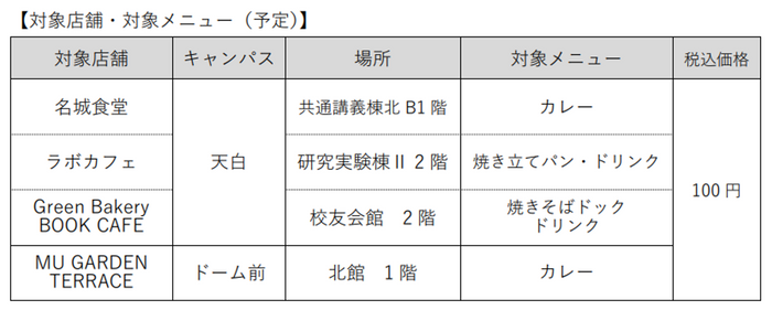 ・280 円分のメニューを「100 円朝食」として提供。差額は寄付金(名城大学教育振興資金)から補填。