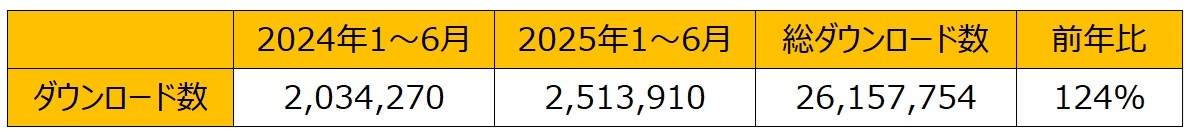 ・上半期ダウンロード数は約250万、累計ダウンロード数は約2,600万、前年同期比124%と伸長しました。