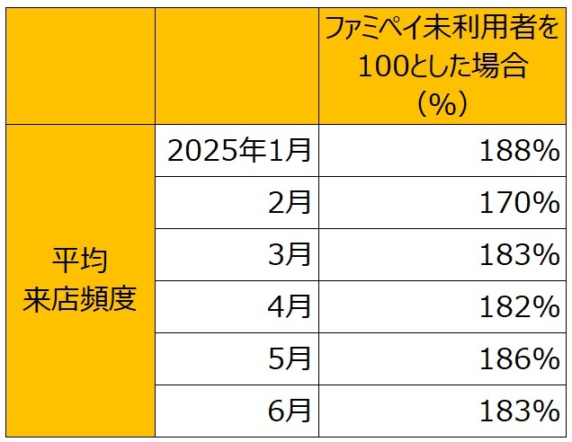 ・平均来店頻度はファミペイ未利用者(※)と比較し、すべての月で1.7~1.8倍となり、「ファミペイ」が一種の来店きっかけになっていることが分かります。