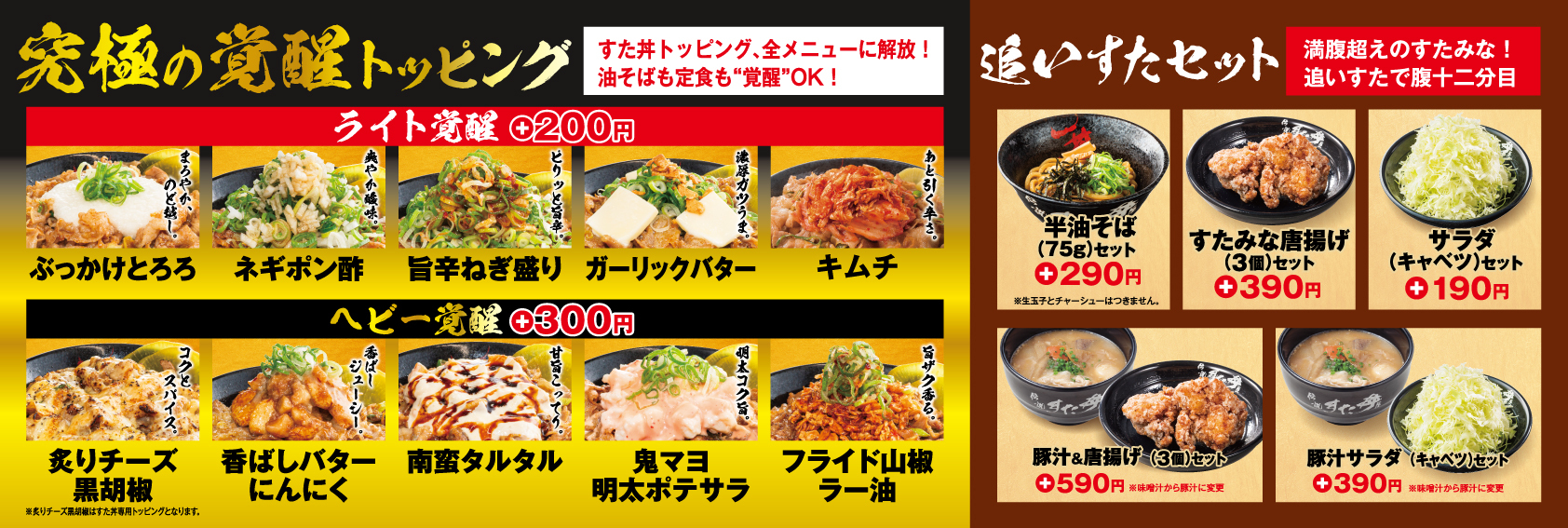 これらのトッピングは、それぞれの素材や味の特徴を最大限に引き出す工夫を施しており、すた丼とともにお楽しみいただくことはもちろん、お好みの定食や油そばに自由に組み合わせることで、自分だけのオリジナルの味を作り上げることができます。