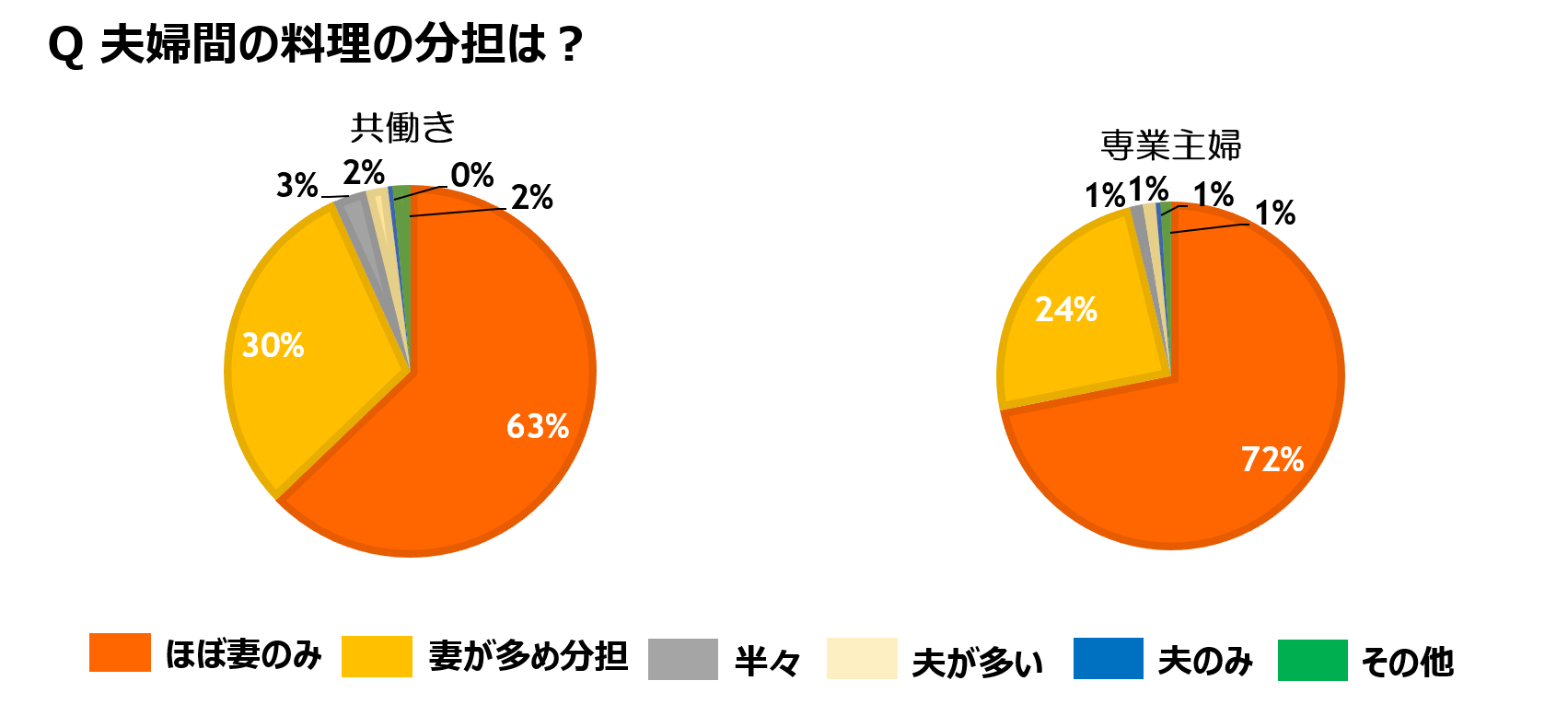 妻が有職主婦の場合、料理は「ほぼ妻のみ」が63%、「妻が多め分担」が30%。併せて93%が「主に妻が料理を担っている」という回答となりました。専業主婦の場合は96%でした。