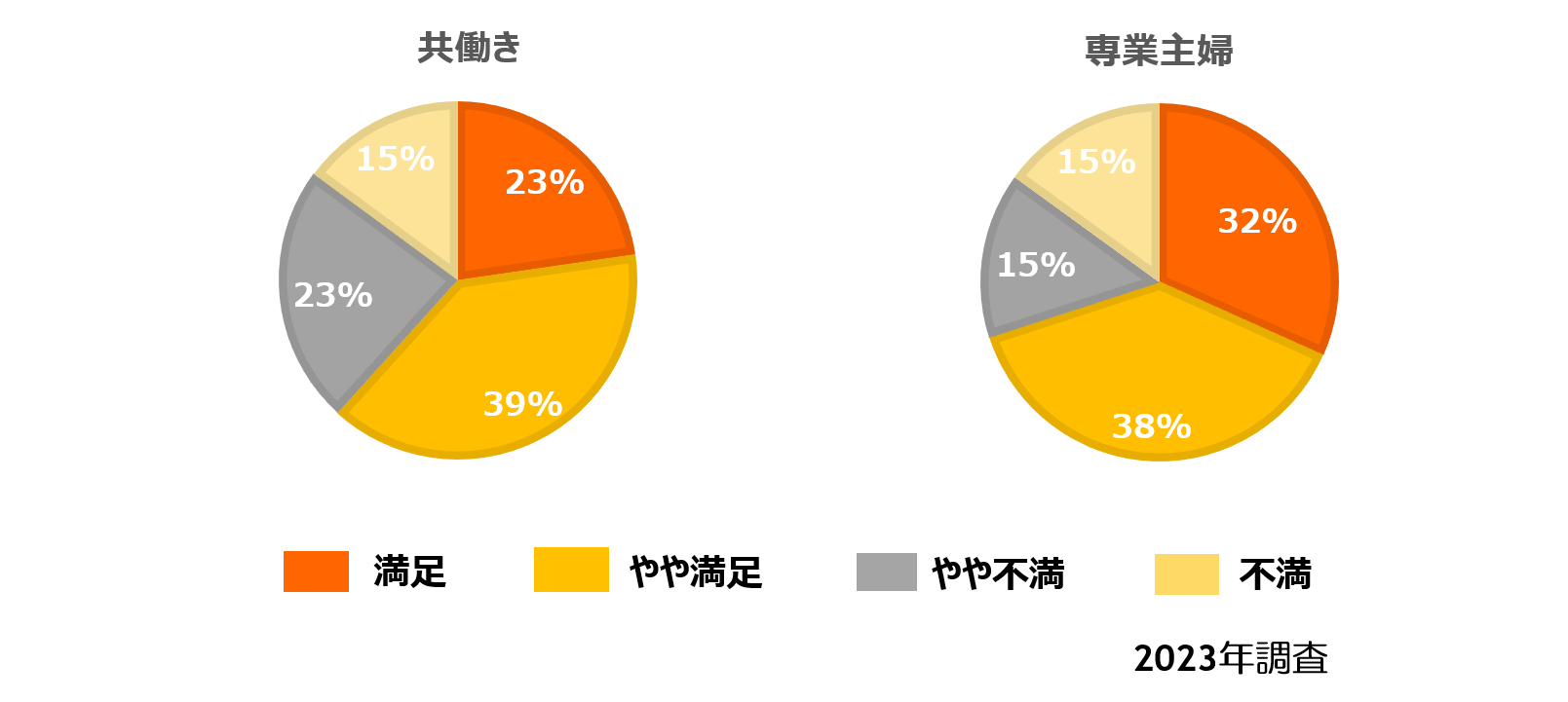 就業状況別にみると、「満足+やや満足」と回答したのは、共働き62%、専業主婦70%。共働きの場合は38%が分担に「不満+やや不満」と感じていることがわかります。
