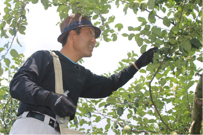 しかし、握りこぶしほどある大きさの「摘果リンゴ」を見て「もったいない」と感じ、何か活用できないかと模索し、地域のリンゴ生産者、地域のJA、マツザワが共同で、いろいろな方法を考え実行。消毒の種類と散布するタイミングを変更し、テストを繰り返し、新たな防除体系をつくり出し、地域をあげて摘果リンゴを食用利用する仕組みをつくりあげました。