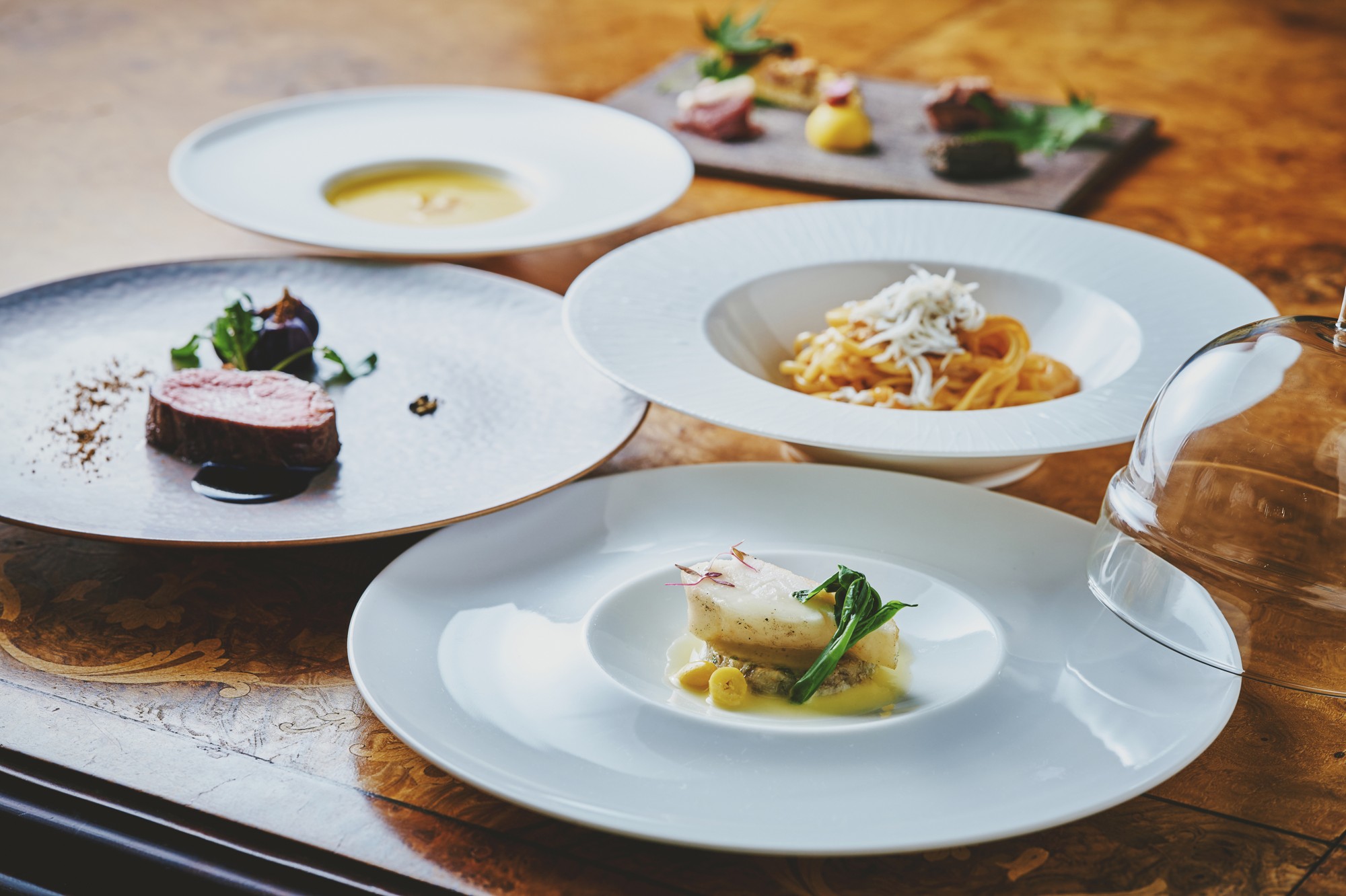 アミューズ5種、松茸のロワイヤル仕立て、旬魚のカルパッチョ 柿とモッツアレラのカプレーゼ仕立て、鰆の炙り 柚子胡椒風味のサルサヴェルデ、足赤海老のビスククリームパスタ、鮮魚炭焼 浅利と白ワインのソース、淡路いざなみ黒牛の薪焼 赤ワインとりんごのソース、洋梨のデクリネゾン など