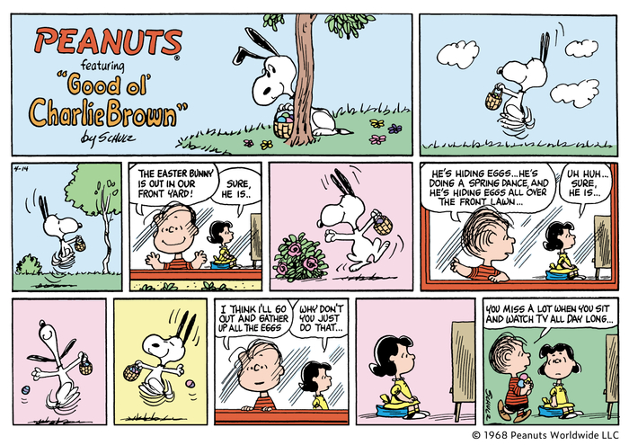 作者チャールズ M. シュルツ氏の描く、チャーリー・ブラウン、スヌーピーをはじめとしたピーナッツ・ギャングの日常生活をテーマにした新聞コミック「ピーナッツ」では、学校が休みになるイースターは子どもたちにとって関わりが深く、重要な季節のエピソードとしてイースターのシーンがたびたび登場します。