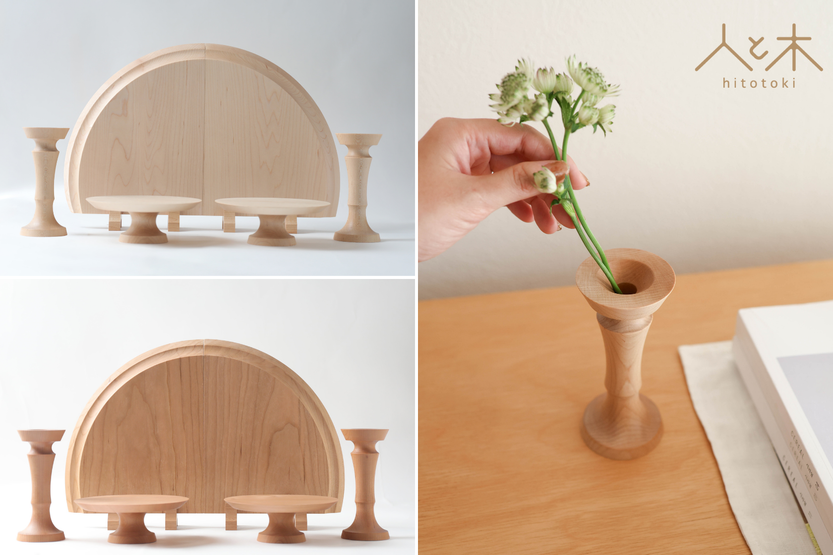 台座・屏風・一輪挿しは天然木で、メイプルの無垢材を使用し明るく美しい木肌が特徴のナチュラルと、年を経るごとに深みが増し飴色の美しい艶がでてくるブラックチェリーの2種類をご用意しました。雛祭りが終わっても活用できる台座や一輪挿しは、一年を通して楽しめるシンプルなデザインです。