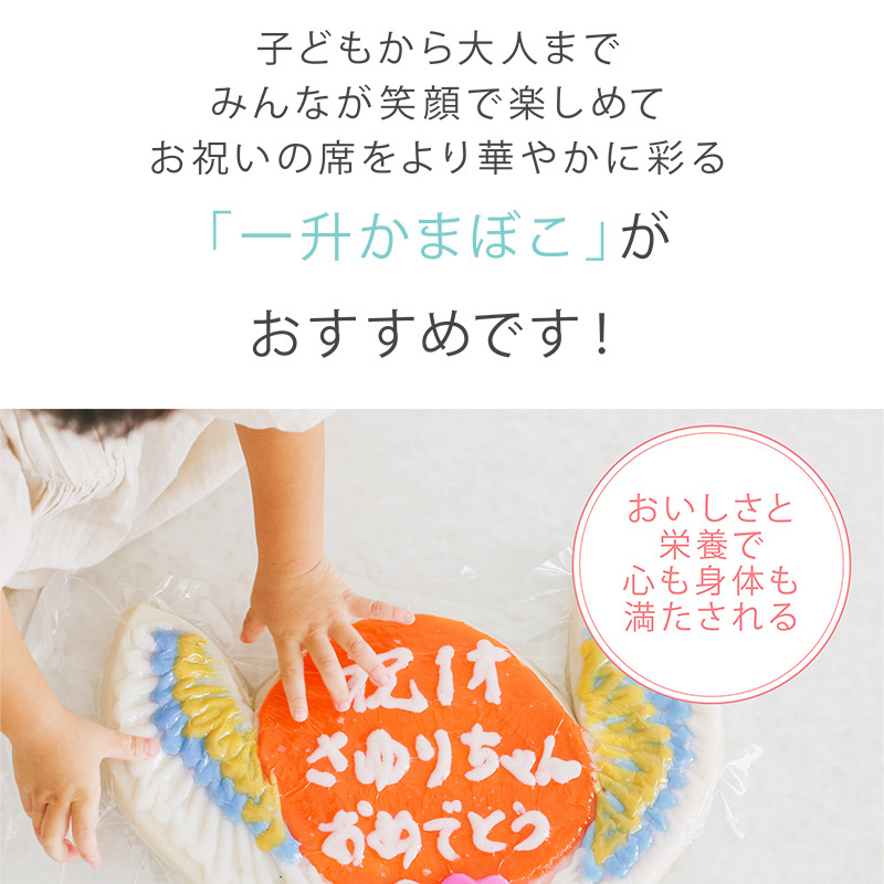 (2) 子供たちは親にとって、天使のような存在です。一升かまぼこは、そういった親御さんの気持ちを、背中に天使の羽をそっと添えるデザインで表現しました。また、かまぼこには、お子様の名前やメッセージを入れることができます。色鮮やかな一升かまぼこは、写真映えすること間違いなし。お祝いの席を華やかに彩る、世界に一つしかないオリジナルのかまぼこで、お子様の成長をお祝いします。
