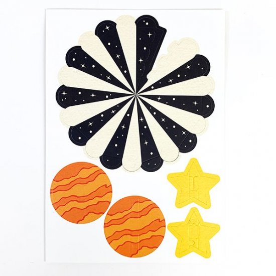 それぞれの型をシートから抜き、あとは糸を挟んで組み立てるだけでモビールの完成です。