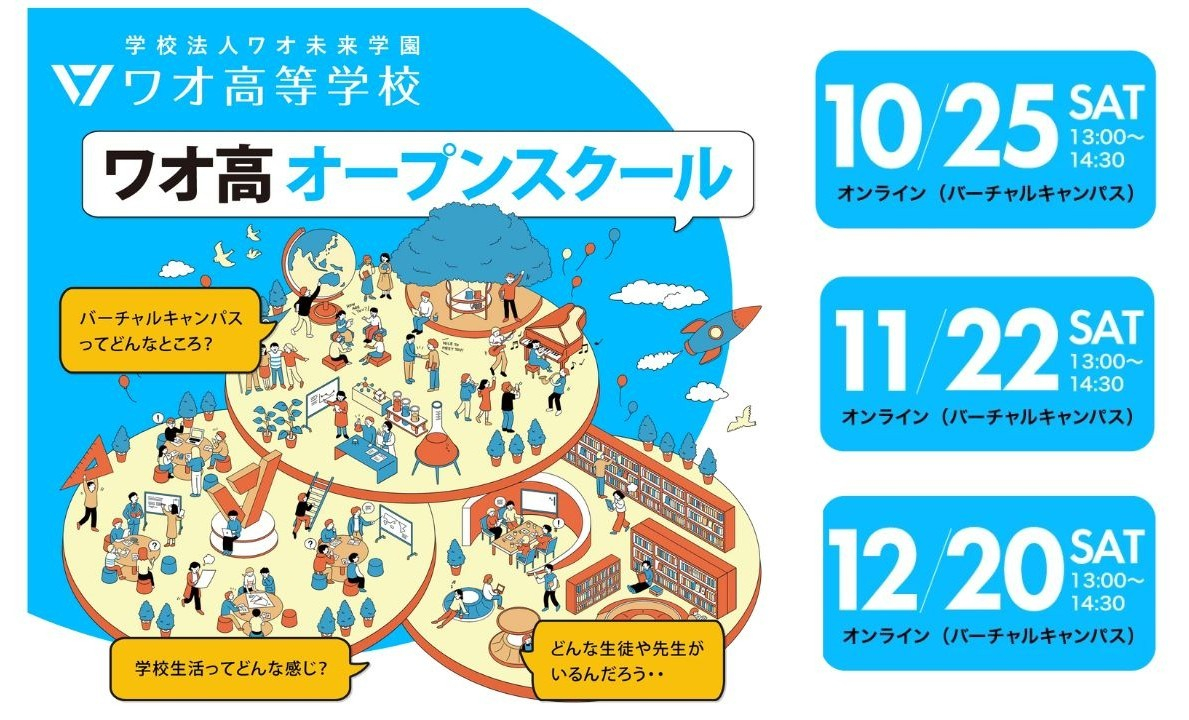 教養探究で哲学・科学・経済を学べる通信制高校・学校法人ワオ未来学園 ワオ高等学校(所在地:岡山県岡山市、校長:平田強)では、10月~12月もオンラインにて「ワオ高オープンスクール」を実施いたします。