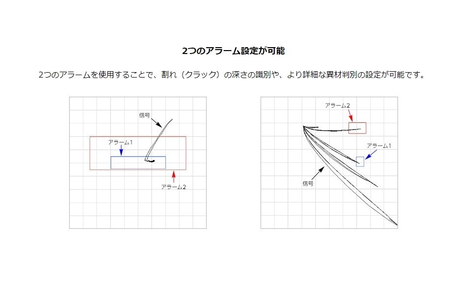 圧倒的なコンパクトサイズながら、2Hz~37MHzの周波数および最大20Vのプローブドライブに対応、上置プローブから大型の貫通コイルまで様々なプローブに対応します。さらに、1秒間に最大7,800点の高速サンプリング、2つのアラーム設定など、上位機種に劣らない素晴らしい探傷能力を備えています。