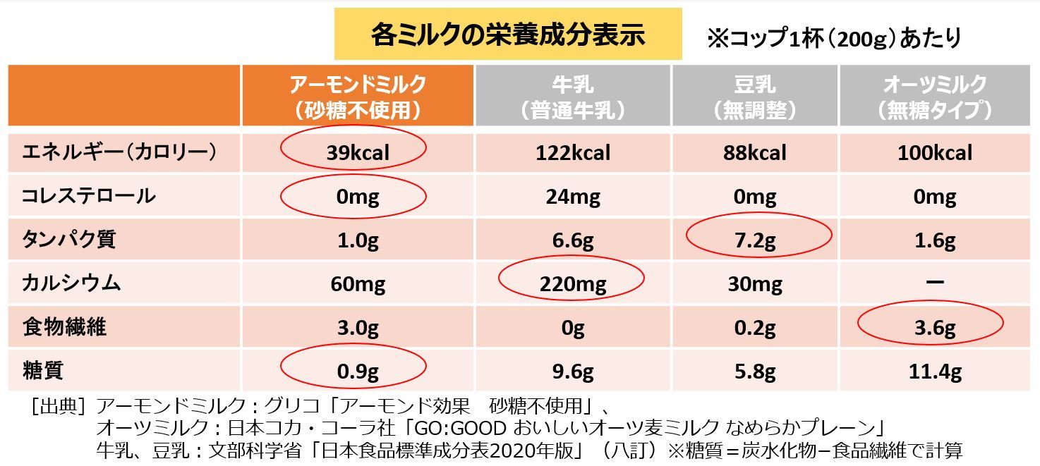 アーモンドミルクにはどのような特徴があるのでしょうか?牛乳、豆乳、オーツミルクで、カロリーや栄養成分を比較しました。アーモンドミルクは他のミルクよりもカロリーが低く(※)、コレステロールゼロ、糖質も低いのが特徴です。牛乳は、動物性でカルシウム、豆乳はたんぱく質、オーツミルクは食物繊維が多く、一口にミルクと言ってもそれぞれ成分や特徴が異なるので、用途に応じて使い分けましょう。またアーモンドは、「天然のサプリメント」とも呼ばれており、栄養豊富なため、ビタミンEや、ポリフェノール、食物繊維、オレイン酸の効果が期待できます。