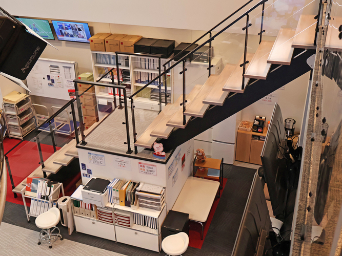 今回、報道局フロアのセットには、ブラックの桁、ホワイトの金具、グレー系の踏板という配色が採用されました。一般住宅では珍しい組み合わせですが、近代的な印象のフロアデザインと調和し、スタイリッシュでモダンな雰囲気を演出しています。