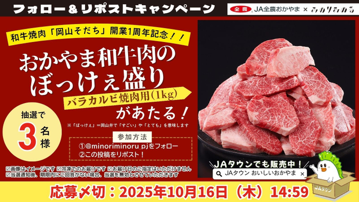 ・商品内容:「おかやま和牛肉のぼっけぇ盛り バラカルビ焼肉用(1kg)」3名様にプレゼント