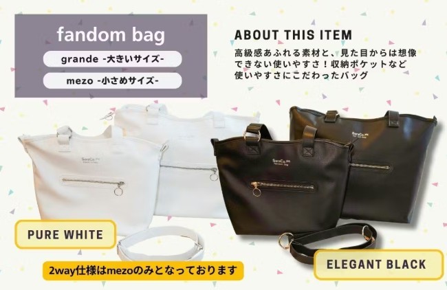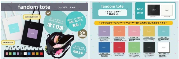 一方、「fandom tote」は軽量でコンパクトに折りたためる大容量トートバッグ。水筒やうちわ、ペンライトなど、イベント参加時に必要なアイテムが全て収納できます。さらに、バッグ本体とポケットの色を選べるカスタマイズ性も魅力です。