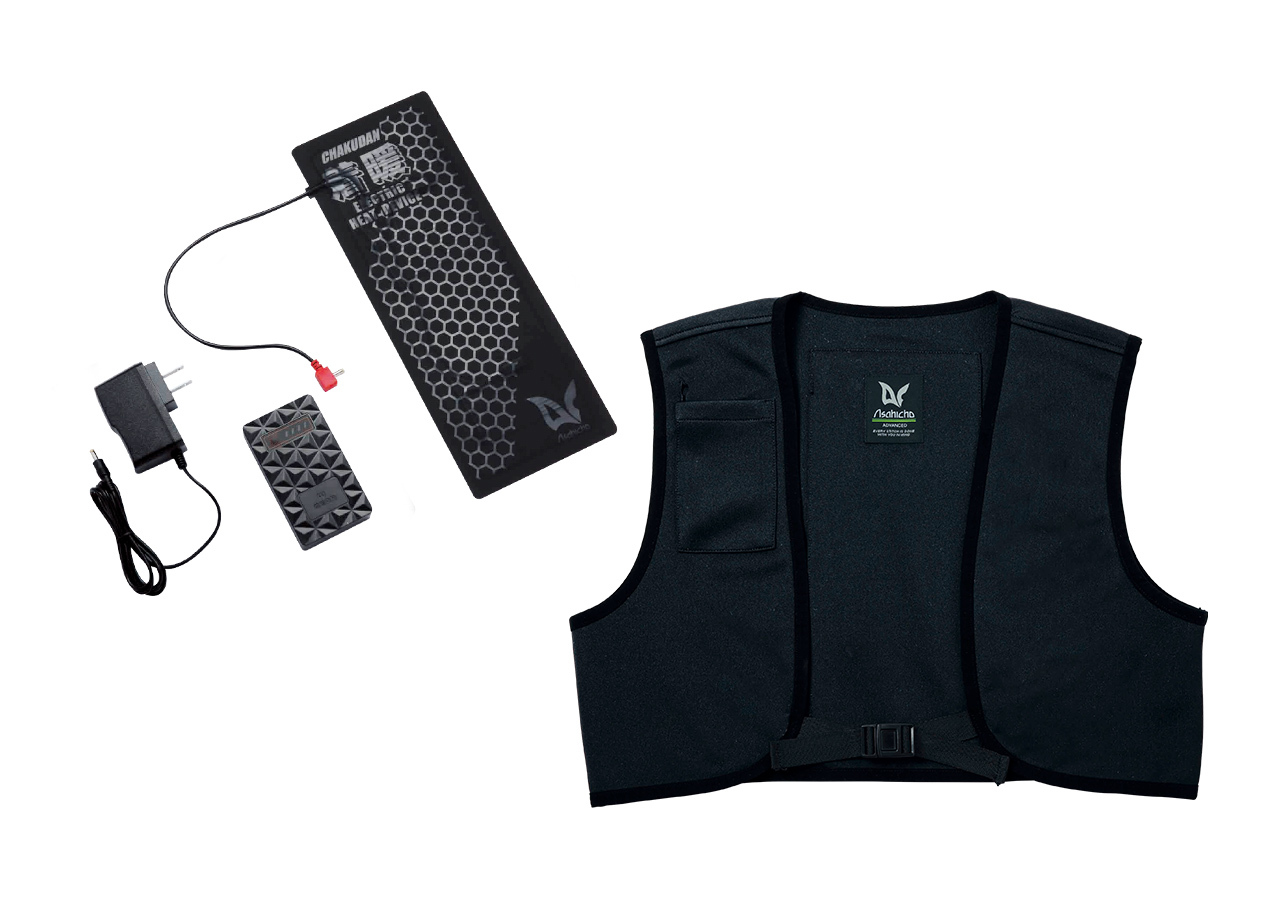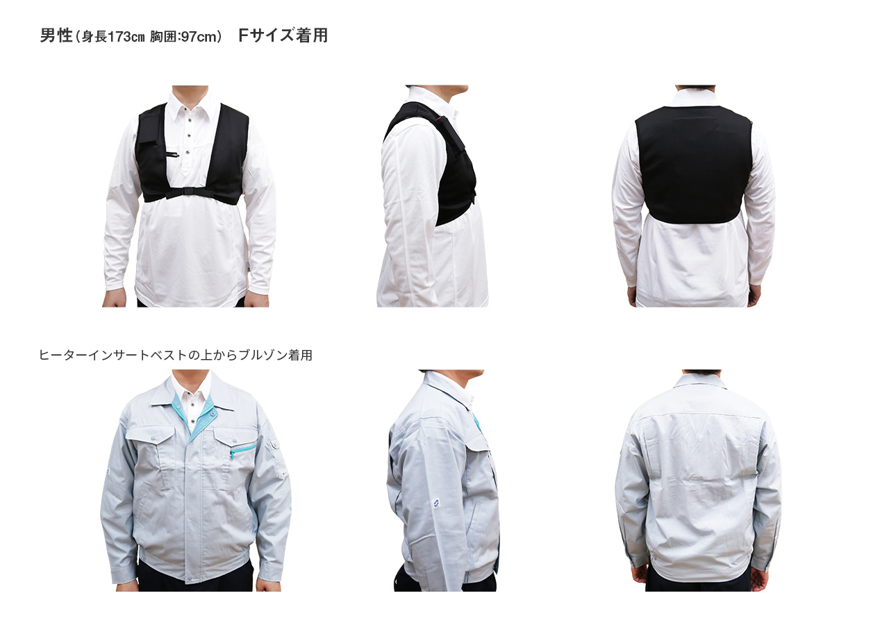 一方今回開発した着暖(R)ヒーターインサートベストセットはインナー型になっており、着用時の本体重量はFサイズで約300g(バッテリー・ヒーター装着)と非常に軽く、ストレッチ性にすぐれインナーとして快適に着用できるよう設計されています。