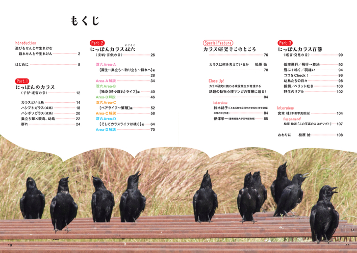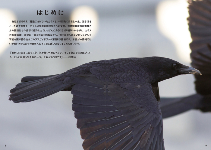 カラスの基礎知識を押さえつつ研究事情などにも触れながら、前作では紙幅もあり割愛したカラス好きの“琴線にふれまくる"ビジュアルを可能なかぎり紹介していきます。楽しく美しいビジュアル、飄々と軽やかながら含蓄のある松原始さんの解説もとともに、カラスの日常、ひいては一生について、遊びながら知識を深めることができます。