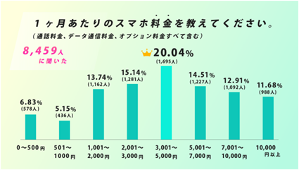 1か月あたりのスマホ料金については、「3,001~5,000円」と回答したユーザーがもっとも多く、全体の20.04%という結果に。続いて「2,001~3,000円:15.14%」、「5,001~7,000円:14.51%」という結果になりました。