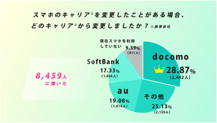 続いて、格安SIMへ移転前に利用していたキャリアについての調査を実施したところ、第1位は「docomo:28.87%」、次いで「その他:25.13%」、「au:19.08%」という結果になりました。「SoftBank」も全体の17.33%とのことから、大手3大キャリアから格安SIMへ移転したユーザーが多いようです。