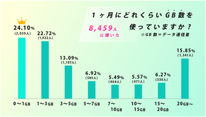 1か月あたりの使用GB数(データ通信量)についてアンケート調査をおこなったところ、「0~1GB」がもっとも多く、全体の24.10%という結果に。「1~3GB」が22.72%と続くことから、低容量プランの人気の高さがうかがえます。3位は「20GB~」で15.85%という結果になりました。
