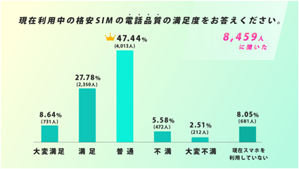 格安SIMの電話品質に関する満足度についてのアンケート回答では、「普通:47.44%」がもっとも多く、「満足:27.78%」「大変満足:8.64%」という結果になりました。