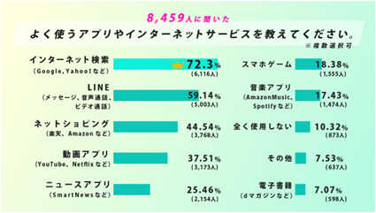 よく使うアプリやインターネットサービスについて、複数回答可のアンケート調査を実施しました。もっとも多かったのは「インターネット検索」で72.3%、続いて「LINE」が59.14%、「ネットショッピング」が44.54%となりました。ほかにも「動画アプリ:37.51%」「ニュースアプリ:25.46%」など、日常生活のさまざまな場面でアプリやインターネットサービスを利用している様子がうかがえます。