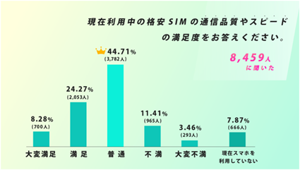 格安SIMの通信品質やスピードに関する満足度のアンケートでは、「普通:44.71%」が最多という結果に。次いで「満足:24.27%」「不満:11.41%」という結果になりました。通信品質やスピードはインターネット回線を使う場所や時間帯に左右される傾向がありますが、おおむね問題なく使えているユーザーが多いようです。