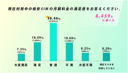 格安SIMの月額料金に関する満足度に対する回答では、もっとも多かった回答は「普通:38.46%」でした。「満足:18.99%」は2位ではあるものの、3位の「不満:18.68%」と僅差の結果になりました。