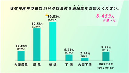 格安SIMの総合的な満足度についてアンケート調査をおこなったところ、「普通」がもっとも多く全体の39.52%を占める結果に。次いで「満足:32.58%」「大変満足:10.04%」という結果になりました。