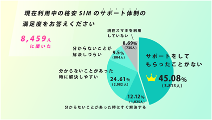 格安SIMのサポート体制に関する満足度についてアンケート調査をおこなったところ、「サポートをしてもらったことがない」がもっとも多く全体の45.08%を占めました。次いで「分からないことがあった時に皆解決しやすい:24.61%」「分からないことがあった時にすぐ解決する:12.12%」という結果に。