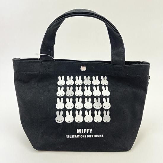 こちらは黒の生地に多くのミッフィーの顔がデザインされた個性的だけどクールなミニトートバッグです。
