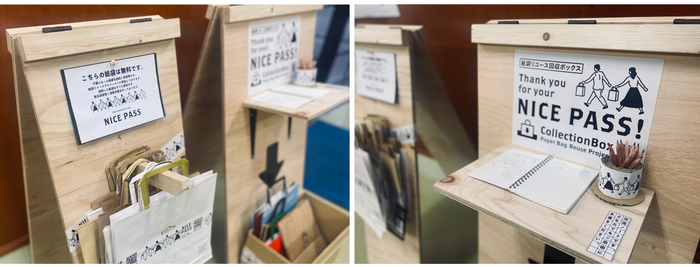 当店は、お土産品の販売だけでなく、観光案内所や各種レンタルサービスの受付も兼ねてるため、多くの観光客の立ち寄りスポットになっています。また、イベント参加やふるさとの味を求める町民の日常的な利用もあるのが特長です。町民は家で眠っている不要な紙袋を観光物産センターに持ち込み、観光物産センターで消毒し、オリジナルシールを貼り、ショッパー(買い物袋)として再利用します。店頭には交流ノートを設置しているので、紙袋を通して観光客と町民の情報交流も行います。