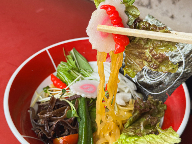 冷たいスープに、ヘルシーなこんにゃく麺と野菜がたっぷりの夏にピッタリの一品。さらに、今年は暑い夏を乗り越えるために、体力回復の“塩おにぎり”が1個付きます。