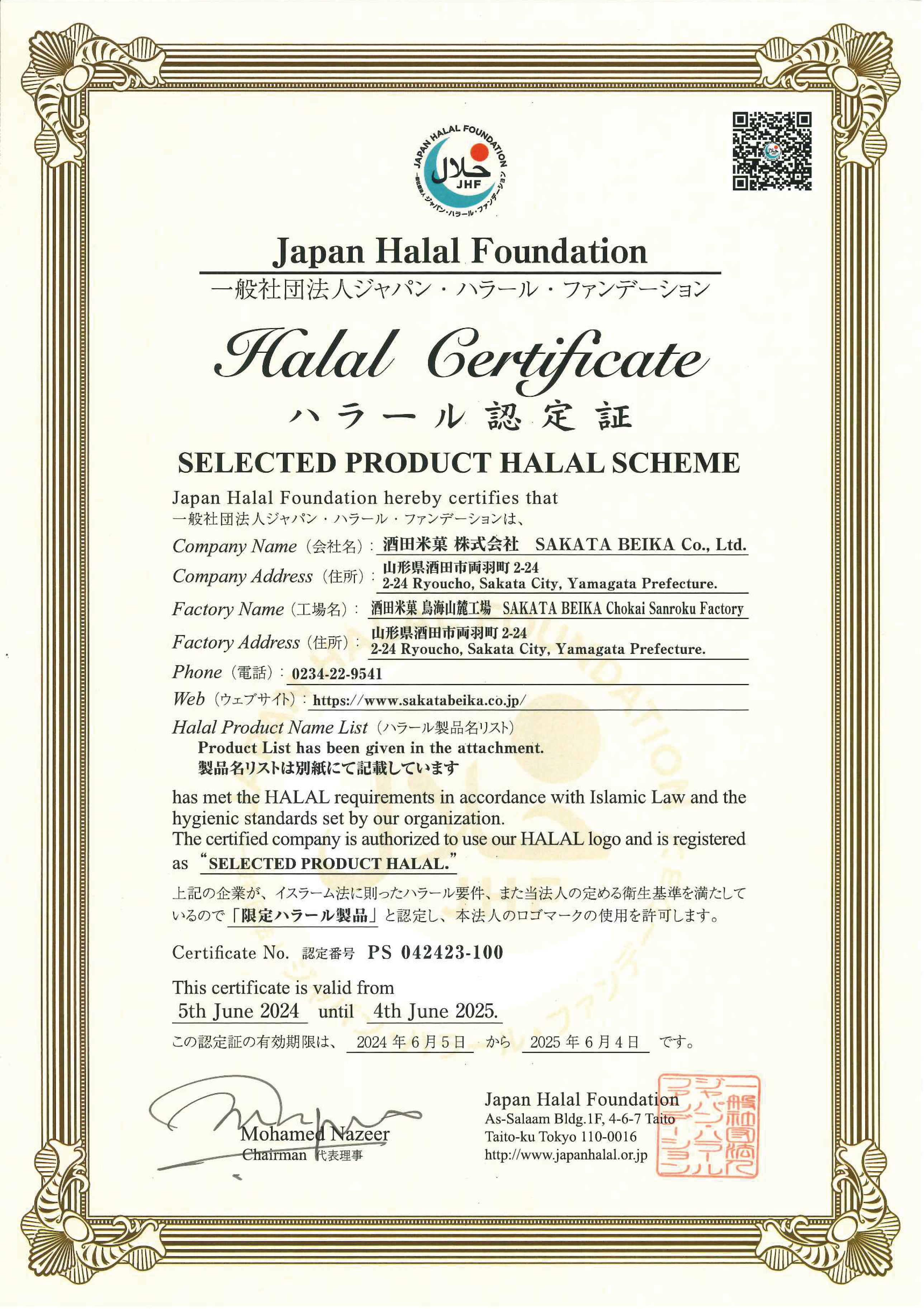 米菓および生地(せんべい・団子)などを製造販売する酒田米菓株式会社(代表:佐藤 栄司、本社:山形県酒田市)は、2024年6月4日に鳥海山麓工場にて、JAKIM(マレーシア)およびMUIS(シンガポール)と相互認証をしている一般社団法人ジャパン・ハラール・ファンデーション(以下 JHF)からハラル認証を取得したことをお知らせいたします。当社が世界中の消費者に高品質で安全な製品を提供するための重要な認証です。さらに、2024年6月19日(水)から21日(金)に東京ビッグサイトで開催される「日本の食品 輸出EXPO」に出展し、認証取得製品を紹介いたします。