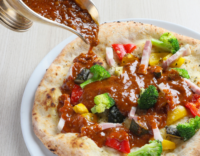 ・スパイシーなカレーソースをかけて食べるという、新しいピッツァのスタイルでお楽しみください。