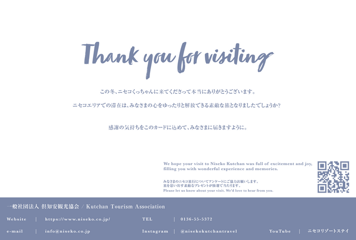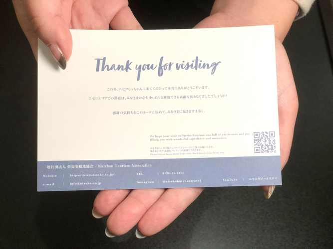 一般社団法人倶知安観光協会(代表理事:吉田 聡)は、この冬北海道ニセコエリアに来ていただくみなさまへ感謝を伝えるポストカードを宿泊施設を中心に3万枚配布します。