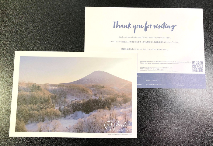 新型コロナウイルスの流行により、心身ともに疲れる日々が続いております。そんな中ニセコエリアへのご旅行を決めていただいたみなさまは、ご旅行前から感染予防策を実施し、またご旅行中も感染予防をしながらのご旅行であると思います。ニセコエリアへのご配慮もいただいていることに感謝し、この冬ニセコエリアに来ていただける皆様に、ポストカードをプレゼントいたします。
