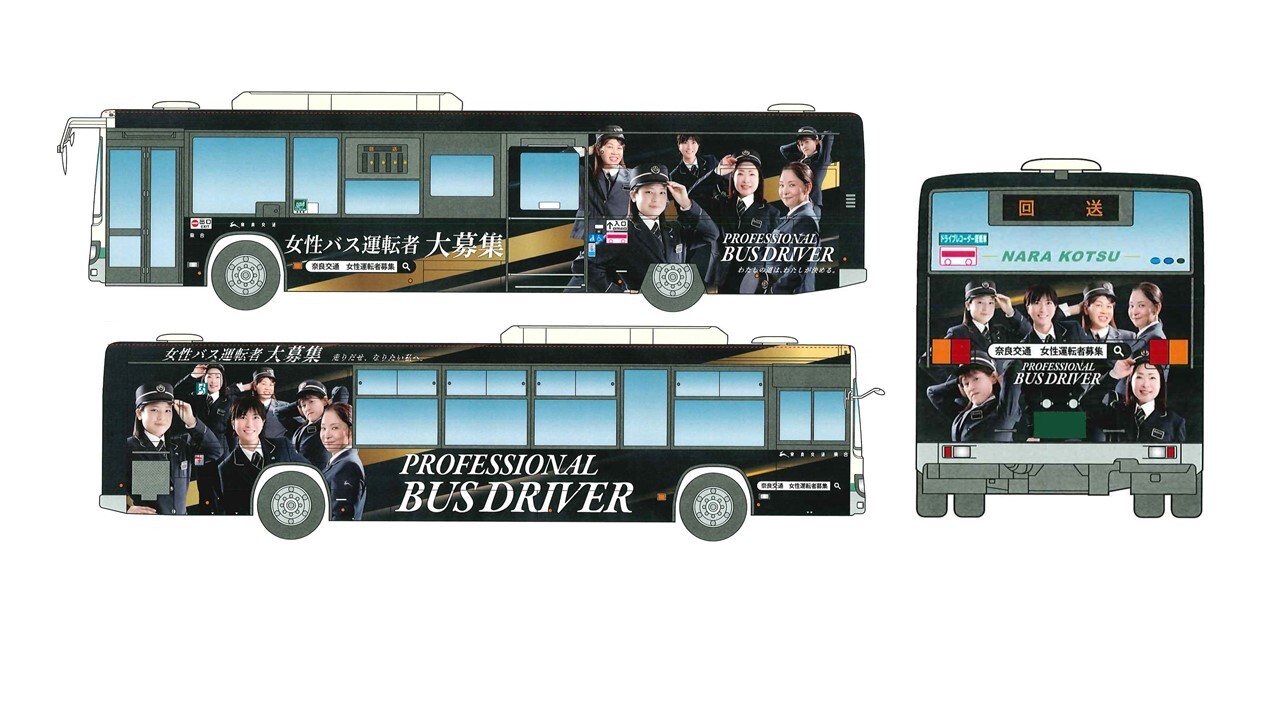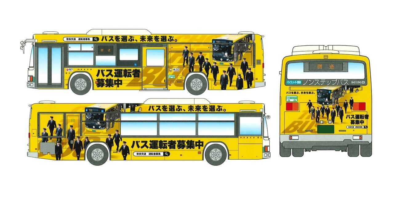 奈良交通では、昨年3月にいきいきと働くバス運転者の姿を描いたラッピングバス3台の運行を開始しましたが、この度、更なるバス運転者の採用拡大を図るため、新たに3台のラッピングバスの運行を開始します。