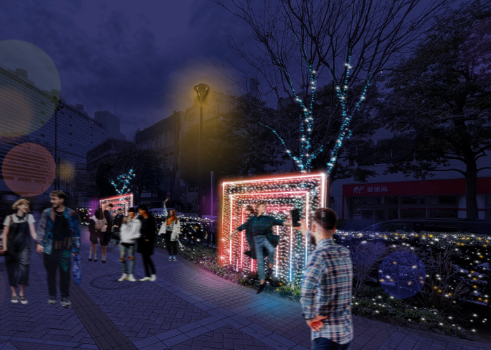 今回、若者が参加したくなるフォトスポットを意識し、訪れた人の目線で「まちを=イルミネーションを歩く楽しさ」という視点を加え、大屋根の下を歩いている時に見えるゲートの連続をモチーフ化。ただのゲートをモチーフにするのではなく、シンボルストリートである大屋根で見える景色をイルミネーションの象徴とし、デザインコンセプトを“ヨコハマイルミナスクエア”にしました。“ヨコハマイルミナスクエア”は、その名のとおりスクエアをモチーフにしたイルミネーションで、横浜駅中央西口駅前広場やみなみ西口エリア(相鉄口)、川沿い周辺エリア(横浜ビブレ前・ハマボール イアス前・一の橋~新田間橋間)を彩ります。また、スクエアの形状を活かしたフォトスポットも設置し、訪れた人がSNSなどで横浜の魅力を発信してもらう仕掛けも用意しています。