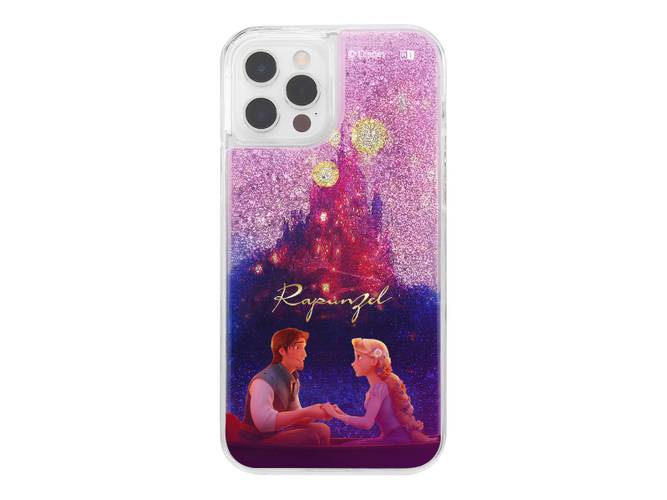 キラキララメが流れるグリッターケース。背面はPC素材、側面は衝撃に強いTPU素材を使用したハイブリッドケースです。ケースに閉じ込めたグリッターが『塔の上のラプンツェル』のデザインをより幻想的に演出します。