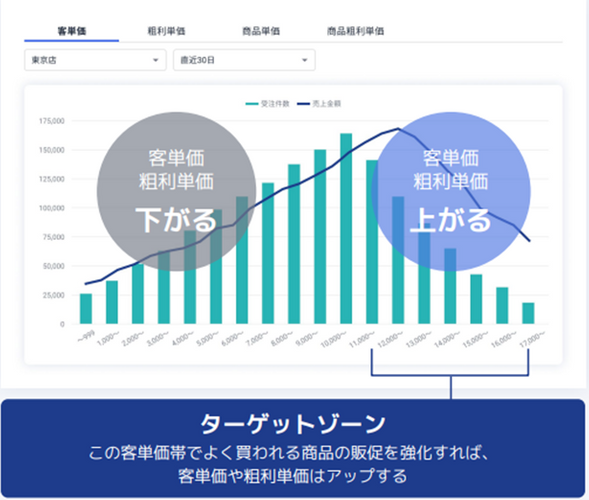 売上や粗利益の増加を目的として、客単価向上に貢献する商品をリストアップできます。これは、客単価帯ごとの売上分布(どれだけの購入者数でどれだけの売上を生み出しているかを客単価帯ごとに並べたもの)を自動表示することで、少ない購入者数で多くの売上を生み出す客単価帯が一目で分かるからです(下図参照)。