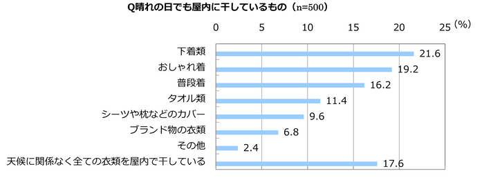 例えば、下着やおしゃれ着など、洗濯物によって干す場所を分けている人が一定数存在することに加え、17.6%の人は天候に関係なく全ての衣類を屋内に干していると回答しました。車の排気ガスやPM2.5などの汚染物質が気になる場合や、花粉や黄砂が飛散する時期にも気軽に室内干しができると便利なのではないでしょうか。