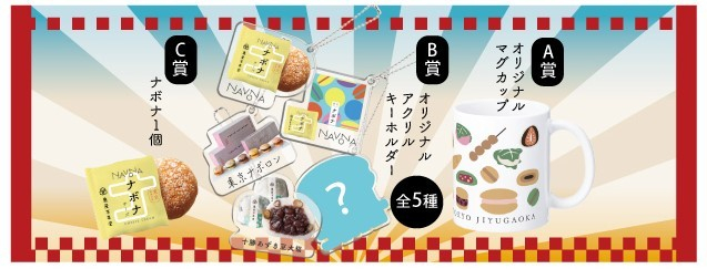 さらに!9月4日(木)~9月7日(日)までの期間中に「亀屋万年堂総本店」にて1,500円(税込)ごとお買い上げいただいた方へオリジナルグッズが当たるガチャポン抽選会を実施いたします。亀屋万年堂の商品をイラストにしたオリジナルマグカップやオリジナルアクリルキーホルダー5種類(ランダム)、ナボナが当たる、はずれなしの抽選会です。オリジナルグッズが手に入るのは総本店だけ!ぜひお得なこの機会に亀屋万年堂総本店へお越しください。