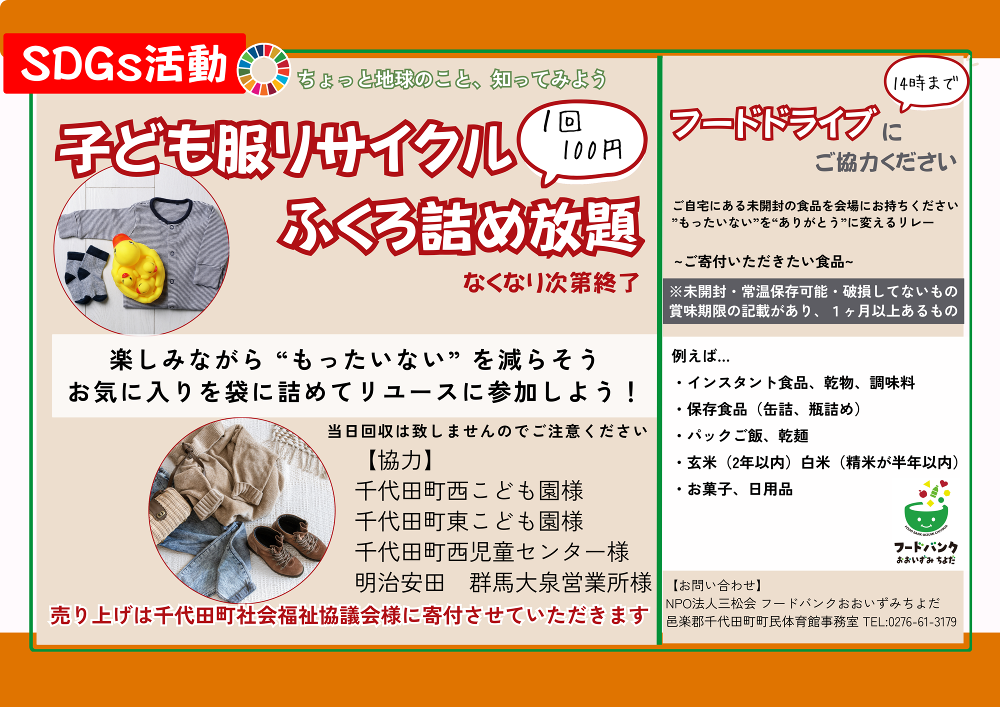 内容:サイズアウトした子ども服や、まだ着られる衣類を“次のご家庭へつなぐ”リユース企画。